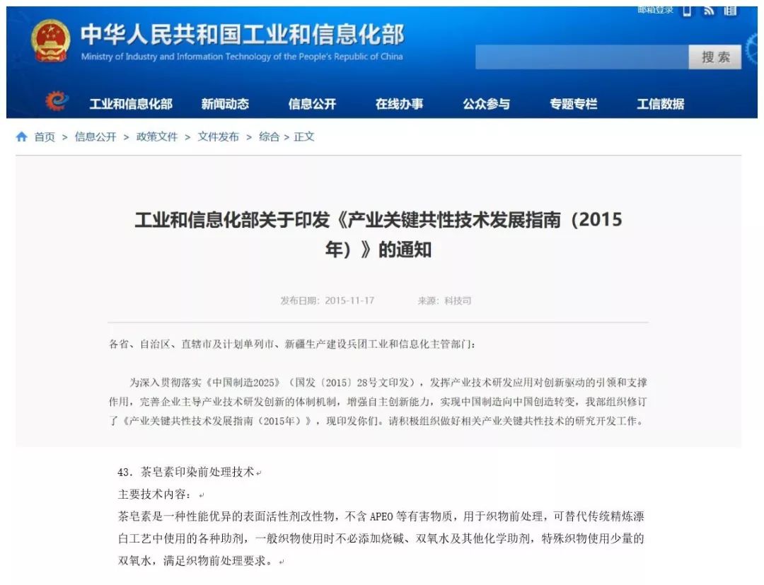 Among the 10 related projects of Shanghai Jintang Bu Gong Tea Saponin Auxiliary to achieve zero discharge of wastewater from pre-treatment of printing and dyeing, two items, including zero discharge of wastewater from continuous pretreatment of towels and zero discharge of continuous wastewater from knitting, were approved in 2017. The Ministry of Industry and Information Technology has passed the review and approval of the Technical Guidelines for Green Development of the Printing and Dyeing Industry, and the remaining eight projects are currently under actual testing.