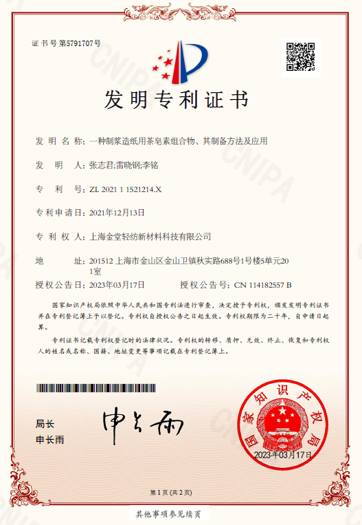 摘要:本發明屬于制漿造紙技術領域,具體地說,涉及一種制漿造紙用茶皂素組合物、其制備方法及應用。所述的制漿造紙用茶皂素組合物包括卜公茶皂素和五水偏硅酸鈉,其中所述的五水偏硅酸鈉的用量為卜公茶皂素的25~60wt%。本發明的茶皂素組合物可有效減少廢紙原料帶入終端再生紙產品的殘留膠粘物,對保證產品質量和保護制漿設備具有顯著作用;同時,該組合物與膠粘物反應速度快,對水中Ca、Na離子具有明顯的降低作用,避免Ca、Na離子含量過高造成的設備和管道結垢問題,有效控制水的硬度,軟化生產用水,保證用水在軟化狀態。