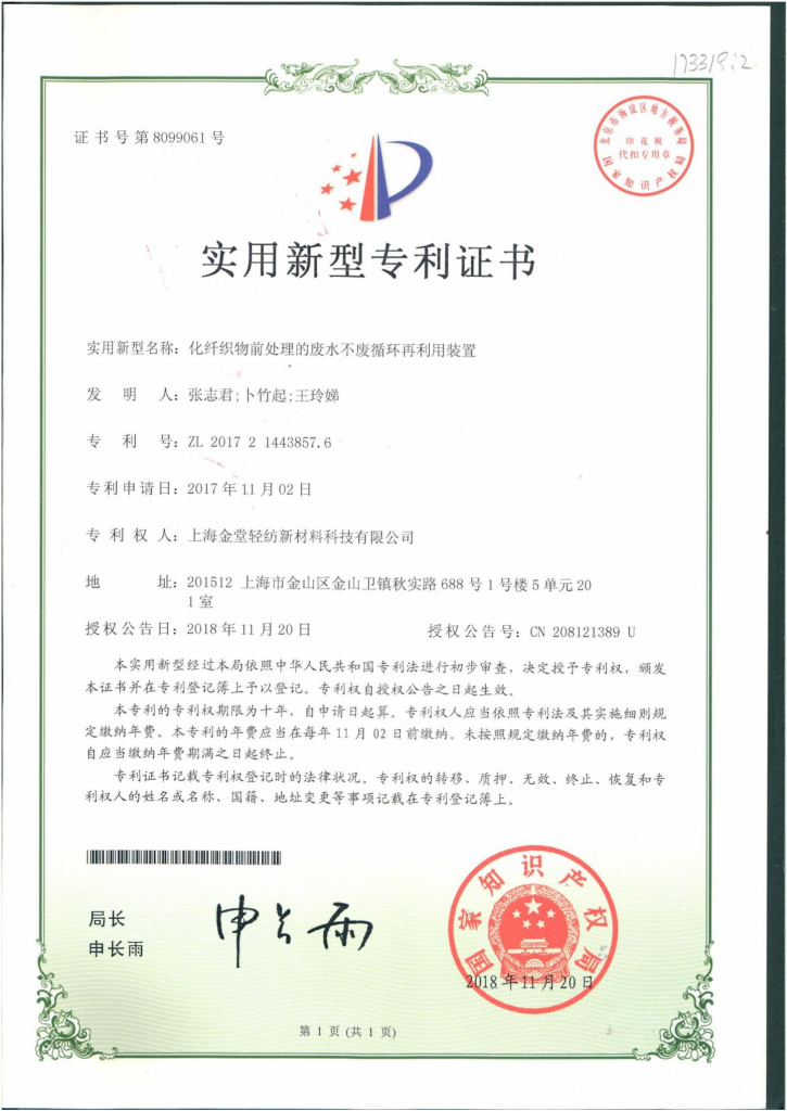 摘要:本實用新型提供了一種化纖織物前處理的廢水不廢循環再利用裝置,包括依次連接的織物染色機、廢水存儲池和過濾裝置;過濾裝置的出水口連接織物染色機的進水口。織物染色機上連接有試劑箱,試劑箱內設有用于前處理工藝的前處理助劑,該前處理助劑為卜公茶皂素。本實用新型采用卜公茶皂素為前處理助劑,可利用化纖織物前處理的廢水回收再利用裝置,實現化纖織物前處理工藝廢水回用于化纖織物印染前處理工序,不僅可以滿足織物染色質量要求,還可以降低生產成本,減少新鮮水的用量和廢水的排放量,對于減輕環境污染,緩解水資源短缺問題,具有重要的現實意義。