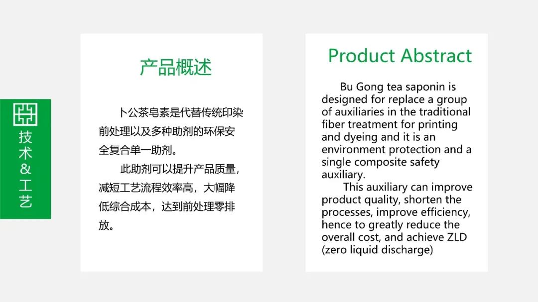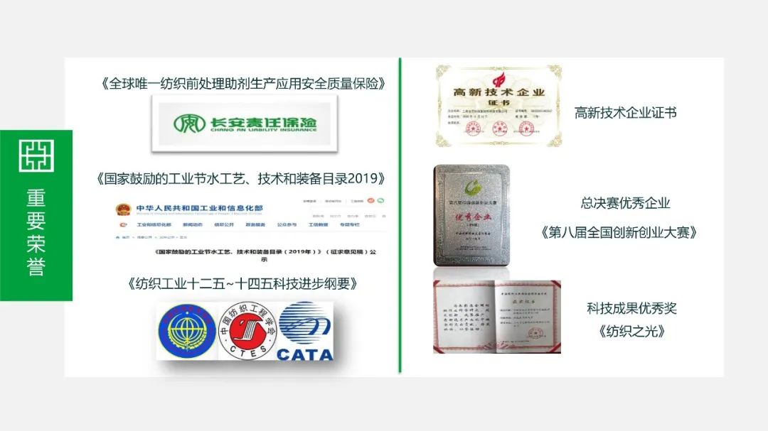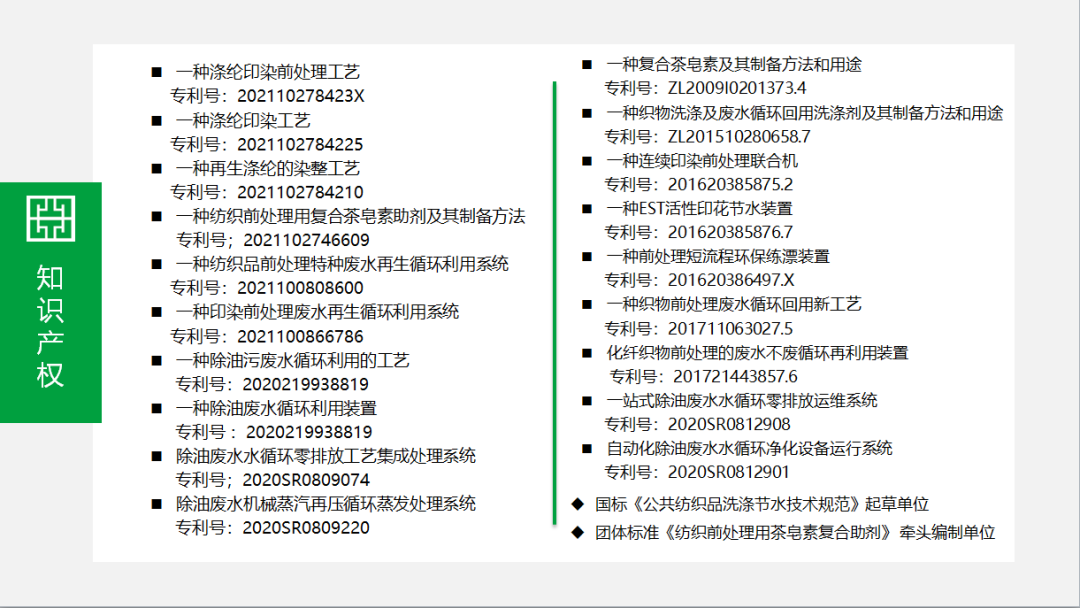 ? ? ? 以全球首創(chuàng)紡織印染低碳前處理工藝技術(shù)及產(chǎn)品專利為例,通過單一新材料助劑替代傳統(tǒng)工藝多種紡織印染前處理化學品,滿足了紡織生產(chǎn)企業(yè)實際需求。