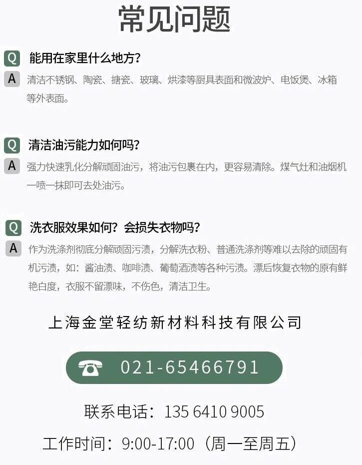 1.脫排油煙機(jī):將粉體溫水溶解成液體(1升水加入15克粉體),噴于油污表面或浸泡脫排油煙機(jī)濾網(wǎng)在稀釋液中 。待3-5分鐘后再用抹布搽干凈或清水沖凈。